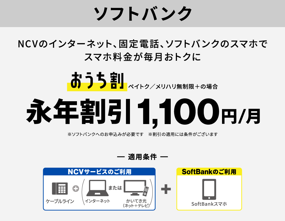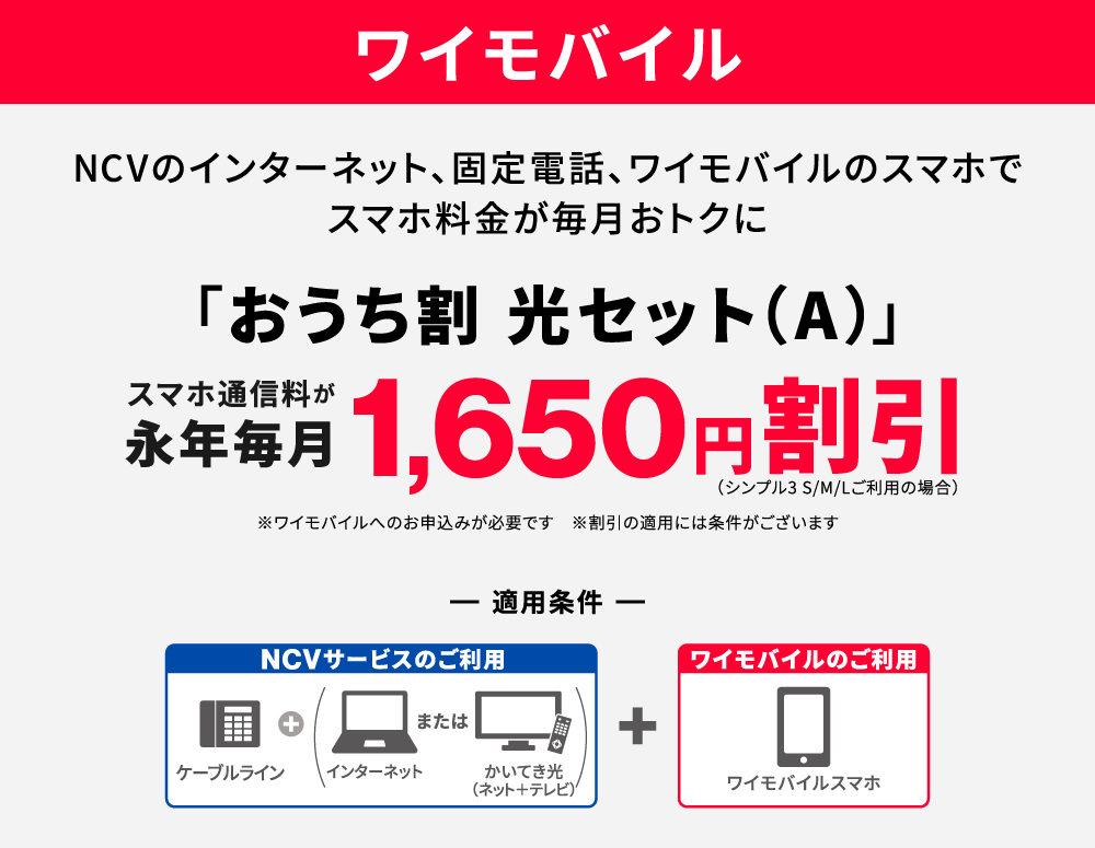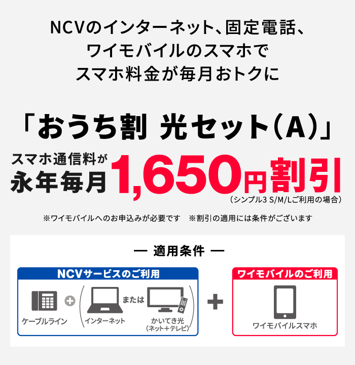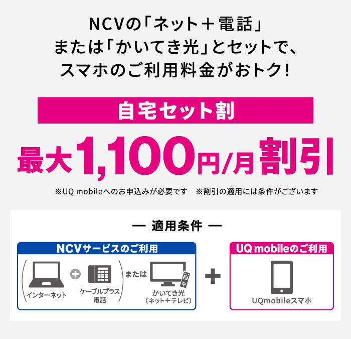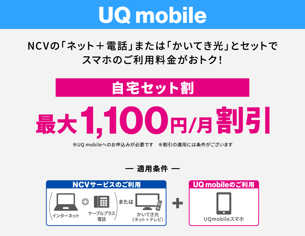 同一性・同一住所でNCVの光1Gインターネット、ケーブルプラス電話に加え、UQ mobileのご利用が必要となります。