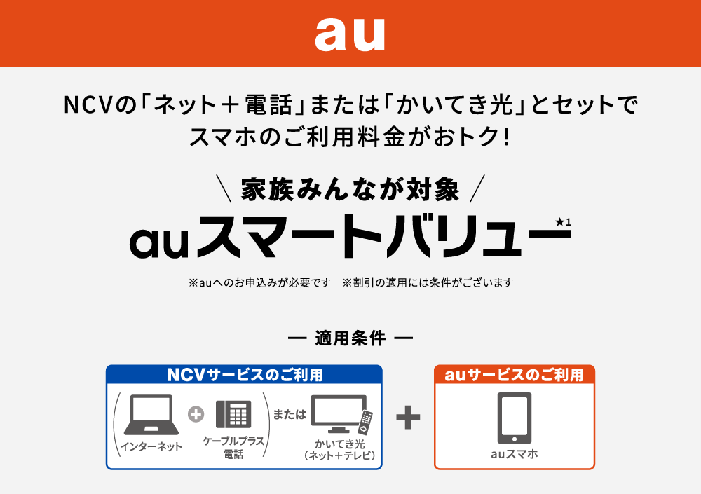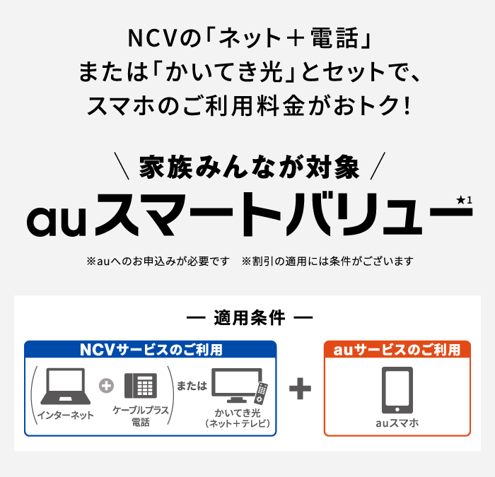 ★1:「ネット+ 電話」、「ネット+ケーブルプラス電話」、「かいてき光」は、同一の会社でのこ利用が必要です。※対象のご自宅のインターネットサービスの詳細については、au取扱店スタッフまたはauホームページをご確認ください。